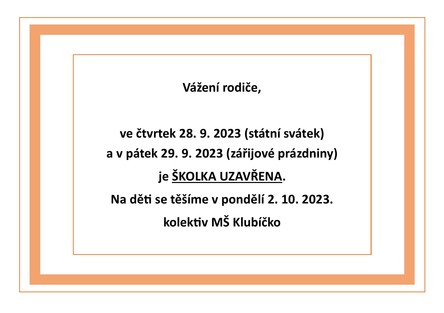 Domů » Aktuality » Uzavření MŠ čtvrtek 28. 9. a pátek 29. 9. 2023Uzavření MŠ čtvrtek 28. 9. a pátek 29. 9. 2023 20.9.2023 autor: Dagmar Stodůlková